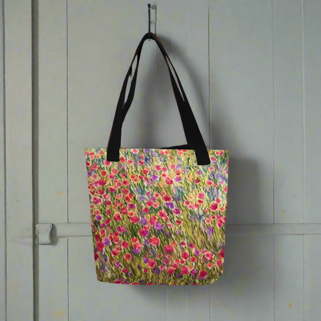 A beautiful all over print tote with an impressionistic floral design will be your go-to bag this spring and summer. Great for the beach, or anytime you need an extra bag for shopping or lunch and everything else that matters.