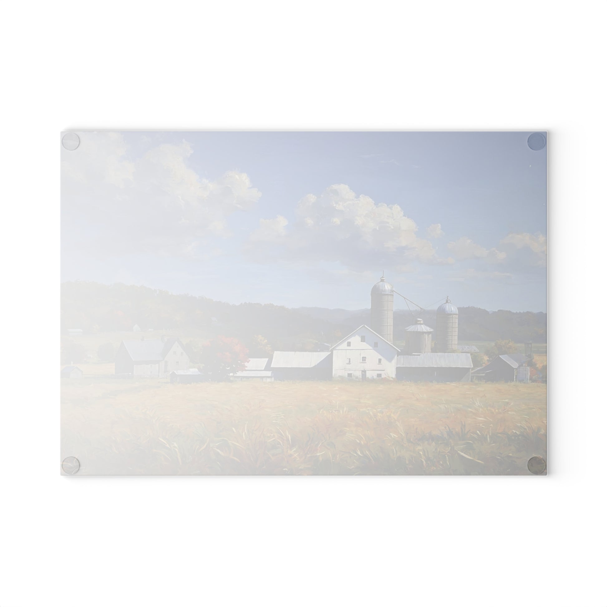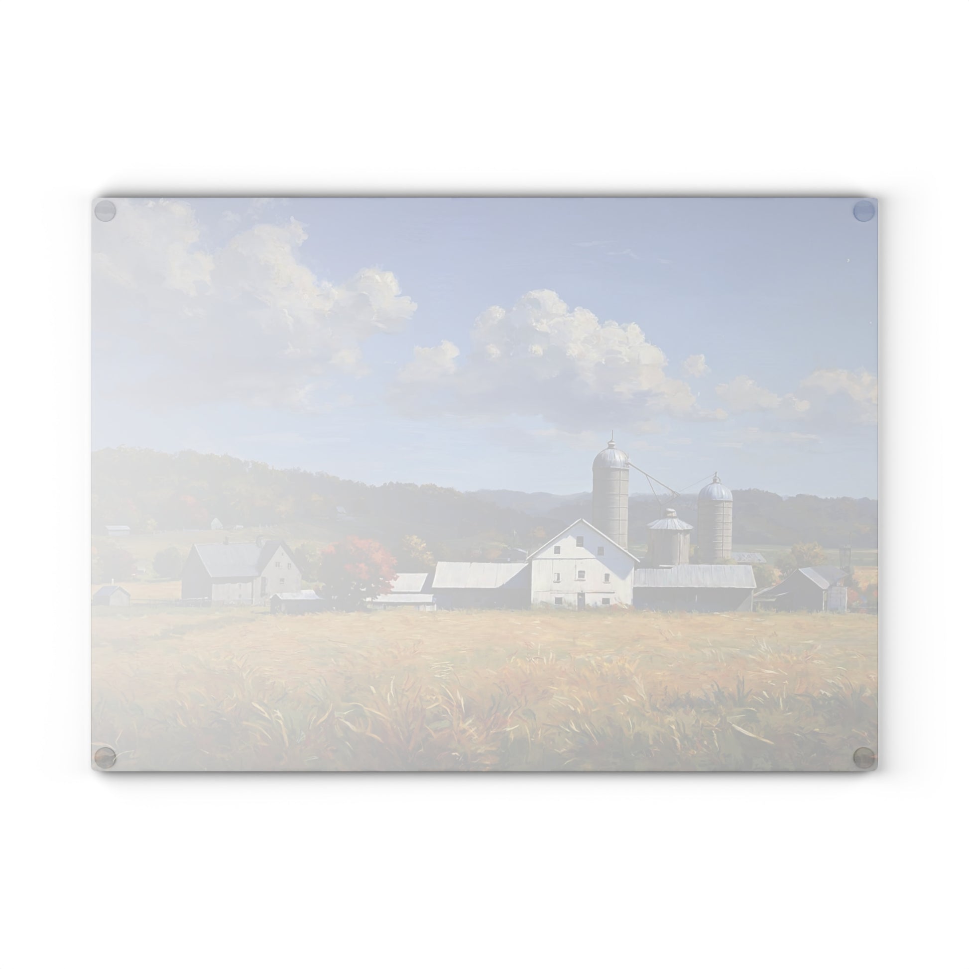 Placing this glass cutting board on your counter brings a quiet corner of Lancaster County into the kitchen. The stylized photograph of an Amish farm captures soft fields, weathered barns, and a sense of slow, deliberate mornings. The glossy tempered glass surface reflects light while the vivid print stays clear beneath your prep — a beautiful backdrop for slicing bread or resting a pot lid between uses. It settles into farmhouse breakfasts, weekend baking sessions, and evenings when you want your workspace to feel like a lived-in quiet place. The textured glass and rubber feet keep it steady during prep, and the image resists wear so the scene remains part of your kitchen story for years.