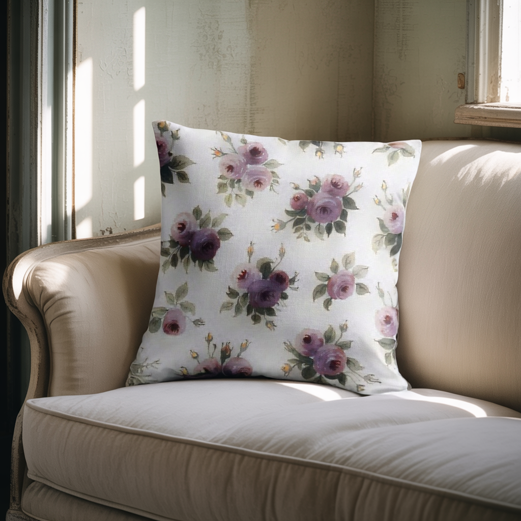 Add a touch of timeless charm to your home with this elegant vintage-style throw pillow. Featuring delicate purple roses framed by soft greenery and a delicate green border, this design is perfect for cottagecore, shabby chic, and farmhouse decor styles. Ideal for cozy living rooms, romantic bedrooms, or garden-inspired sunrooms, this pillow makes a lovely accent piece or thoughtful gift.